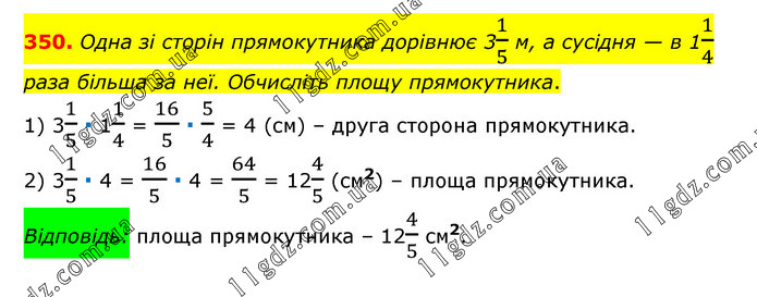Одна зі сторін прямокутника дорівнює 31/5 м, а сусідня — в 11/4 раза більша за неї. Обчисліть площу прямокутника. 1) 31/5 ∙ 11/4 = 16/5 ∙ 5/4 = 4 (см) – друга сторона прямокутника. 2) 31/5 ∙ 4 = 16/5 ∙ 4 = 64/5 = 124/5 (см2) – площа прямокутника. Відповідь: площа прямокутника – 124/5 см2.