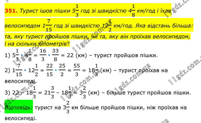 Турист ішов пішки 51/3 год зі швидкістю 41/8 км/год і їхав велосипедом 17/15 год зі швидкістю 121/2 км/год. Яка відстань більша: та, яку турист пройшов пішки, чи та, яку він проїхав велосипедом, і на скільки кілометрів? 1) 51/3 ∙ 41/8 = 16/3 ∙ 33/8 = 22 (км) – турист пройшов пішки. 2) 17/15 ∙ 121/2 = 22/15 ∙ 25/2 = 55/3 = 181/3 (км) – турист проїхав на велосипеді. 3) 22 – 181/3 = 213/3 – 181/3 = 32/3 (км) – більше турист пройшов пішки. Відповідь: турист на 32/3 км більше пройшов пішки, ніж проїхав на велосипеді.