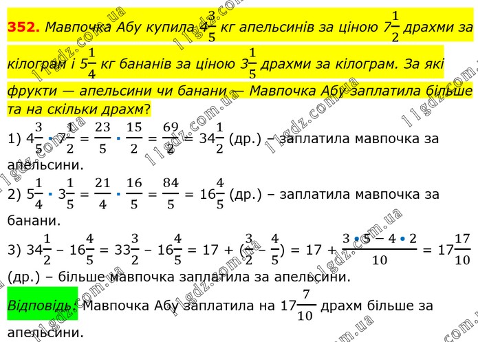 Мавпочка Абу купила 43/5 кг апельсинів за ціною 71/2 драхми за кілограм і 51/4 кг бананів за ціною 31/5 драхми за кілограм. За які фрукти — апельсини чи банани — Мавпочка Абу заплатила більше та на скільки драхм? 1) 43/5 ∙ 71/2 = 23/5 ∙ 15/2 = 69/2 = 341/2 (др.) – заплатила мавпочка за апельсини. 2) 51/4 ∙ 31/5 = 21/4 ∙ 16/5 = 84/5 = 164/5 (др.) – заплатила мавпочка за банани. 3) 341/2 – 164/5 = 333/2 – 164/5 = 17 + (3/2 – 4/5) = 17 + (3 • 5 - 4 • 2)/10 = 1717/10 (др.) – більше мавпочка заплатила за апельсини. Відповідь: Мавпочка Абу заплатила на 177/(10 ) драхм більше за апельсини.