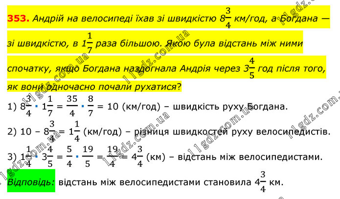 Андрій на велосипеді їхав зі швидкістю 83/4 км/год, а Богдана — зі швидкістю, в 11/7 раза більшою. Якою була відстань між ними спочатку, якщо Богдана наздогнала Андрія через 34/5 год після того, як вони одночасно почали рухатися? 1) 83/4 ∙ 11/7 = 35/4 ∙ 8/7 = 10 (км/год) – швидкість руху Богдана. 2) 10 – 83/4 = 11/4 (км/год) – різниця швидкостей руху велосипедистів. 3) 11/4 ∙ 34/5 = 5/4 ∙ 19/5 = 19/4 = 43/4 (км) – відстань між велосипедистами. Відповідь: відстань між велосипедистами становила 43/4 км.
