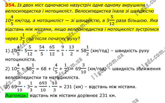 Із двох міст одночасно назустріч одне одному вирушили велосипедистка і мотоцикліст. Велосипедистка їхала зі швидкістю 104/5 км/год, а мотоцикліст — зі швидкістю, в 55/12 раза більшою. Яка відстань між містами, якщо велосипедистка і мотоцикліст зустрілися через 31/3 год після початку руху? 1) 104/5 ∙ 55/12 = 54/5 ∙ 65/12 = 9/1 ∙ 13/2 = 581/2 (км/год) – швидкість руху мотоцикліста. 2) 104/5 + 581/2 = 68 + (4/5 + 1/2) = 693/10 (км/год) – швидкість зближення велосипедистки та мотоцикліста. 3) 693/10 ∙ 31/3 = 693/10 ∙ 10/3 = 231 (км) – відстань між містами. Відповідь: відстань між містами дорівнює 231 км.