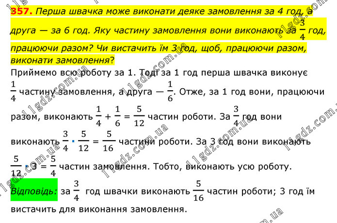 Перша швачка може виконати деяке замовлення за 4 год, а друга — за 6 год. Яку частину замовлення вони виконають за 3/4 год, працюючи разом? Чи вистачить їм 3 год, щоб, працюючи разом, виконати замовлення? Приймемо всю роботу за 1. Тоді за 1 год перша швачка виконує 1/4 частину замовлення, а друга — 1/6. Отже, за 1 год вони, працюючи разом, виконають 1/4 + 1/6 = 5/12 частин роботи. За 3/4 год вони виконають 3/4 ∙ 5/12 = 5/(16 ) частини роботи. За 3 год вони виконають 5/12 ∙ 3 = 5/4 частин замовлення. Тобто, виконають усю роботу. Відповідь: за 3/4 год швачки виконають 5/16 частин роботи; 3 год їм вистачить для виконання замовлення.