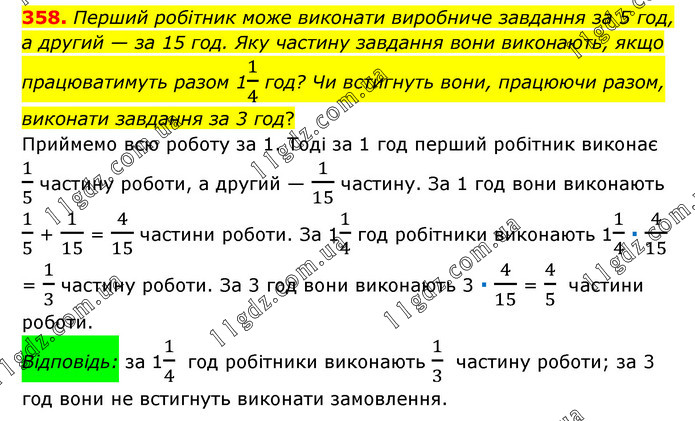 Перший робітник може виконати виробниче завдання за 5 год, а другий — за 15 год. Яку частину завдання вони виконають, якщо працюватимуть разом 11/4 год? Чи встигнуть вони, працюючи разом, виконати завдання за 3 год? Приймемо всю роботу за 1. Тоді за 1 год перший робітник виконає 1/5 частину роботи, а другий — 1/15 частину. За 1 год вони виконають 1/5 + 1/15 = 4/15 частини роботи. За 11/4 год робітники виконають 11/4 ∙ 4/15 = 1/3 частину роботи. За 3 год вони виконають 3 ∙ 4/15 = 4/5 частини роботи. Відповідь: за 11/4 год робітники виконають 1/3 частину роботи; за 3 год вони не встигнуть виконати замовлення.