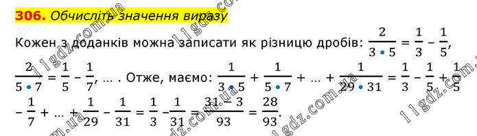 Обчисліть значення виразу Кожен з доданків можна записати як різницю дробів: 2/(3 • 5) = 1/3 – 1/5, 2/(5 • 7) = 1/5 – 1/7, … . Отже, маємо: 1/(3 • 5) + 1/(5 • 7) + … + 1/(29 • 31) = 1/3 – 1/5 + 1/5 – 1/7 + … + 1/29 – 1/31 = 1/3 –1/31 = (31 - 3)/93 = 28/93.