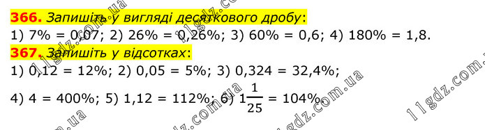 366. Запишіть у вигляді десяткового дробу: 1) 7% = 0,07; 2) 26% = 0,26%; 3) 60% = 0,6; 4) 180% = 1,8. 367. Запишіть у відсотках: 1) 0,12 = 12%; 2) 0,05 = 5%; 3) 0,324 = 32,4%; 4) 4 = 400%; 5) 1,12 = 112%; 6) 11/25 = 104%.