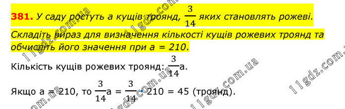У саду ростуть а кущів троянд, 3/14 яких становлять рожеві. Складіть вираз для визначення кількості кущів рожевих троянд та обчисліть його значення при а = 210. Кількість кущів рожевих троянд: 3/14а. Якщо а = 210, то 3/14а = 3/14 ∙ 210 = 45 (троянд).