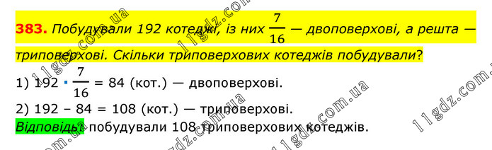 Побудували 192 котеджі, із них 7/16 — двоповерхові, а решта — триповерхові. Скільки триповерхових котеджів побудували? 1) 192 ∙ 7/16 = 84 (кот.) — двоповерхові. 2) 192 – 84 = 108 (кот.) — триповерхові. Відповідь: побудували 108 триповерхових котеджів.