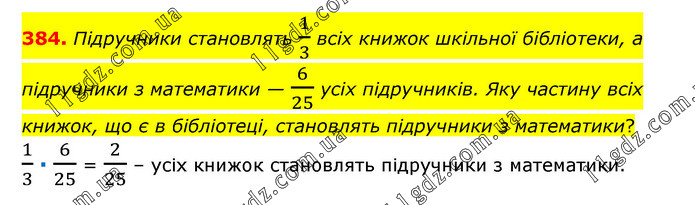 Підручники становлять 1/3 всіх книжок шкільної бібліотеки, а підручники з математики — 6/25 усіх підручників. Яку частину всіх книжок, що є в бібліотеці, становлять підручники з математики? 1/3 ∙ 6/25 = 2/25 – усіх книжок становлять підручники з математики.
