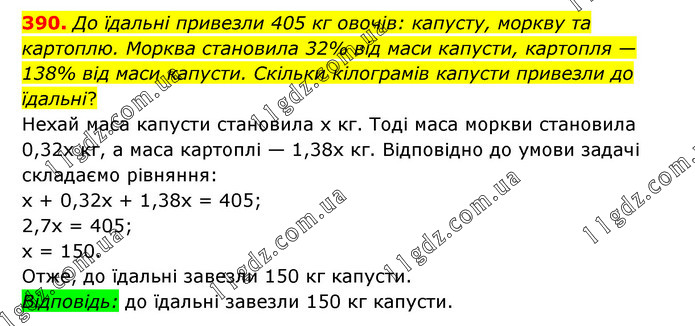До їдальні привезли 405 кг овочів: капусту, моркву та картоплю. Морква становила 32% від маси капусти, картопля — 138% від маси капусти. Скільки кілограмів капусти привезли до їдальні? Нехай маса капусти становила х кг. Тоді маса моркви становила 0,32х кг, а маса картоплі — 1,38х кг. Відповідно до умови задачі складаємо рівняння: х + 0,32х + 1,38х = 405; 2,7х = 405; х = 150. Отже, до їдальні завезли 150 кг капусти. Відповідь: до їдальні завезли 150 кг капусти.