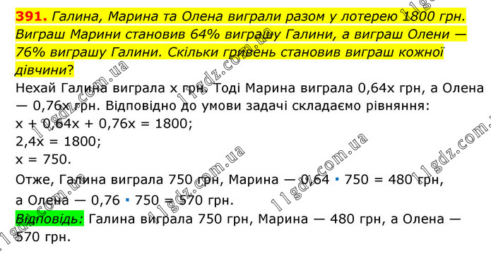 Галина, Марина та Олена виграли разом у лотерею 1800 грн. Виграш Марини становив 64% виграшу Галини, а виграш Олени — 76% виграшу Галини. Скільки гривень становив виграш кожної дівчини? Нехай Галина виграла х грн. Тоді Марина виграла 0,64х грн, а Олена — 0,76х грн. Відповідно до умови задачі складаємо рівняння: х + 0,64х + 0,76х = 1800; 2,4х = 1800; х = 750. Отже, Галина виграла 750 грн, Марина — 0,64 ∙ 750 = 480 грн, а Олена — 0,76 ∙ 750 = 570 грн. Відповідь: Галина виграла 750 грн, Марина — 480 грн, а Олена — 570 грн.