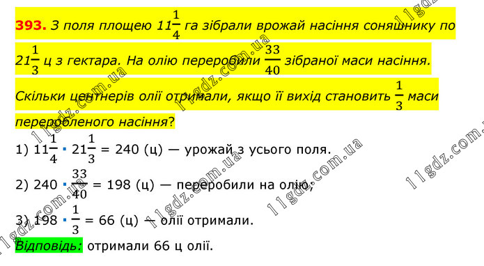 З поля площею 111/4 га зібрали врожай насіння соняшнику по 211/3 ц з гектара. На олію переробили 33/40 зібраної маси насіння. Скільки центнерів олії отримали, якщо її вихід становить 1/3 маси переробленого насіння? 1) 111/4 ∙ 211/3 = 240 (ц) — урожай з усього поля. 2) 240 ∙ 33/40 = 198 (ц) — переробили на олію; 3) 198 ∙ 1/3 = 66 (ц) — олії отримали. Відповідь: отримали 66 ц олії.