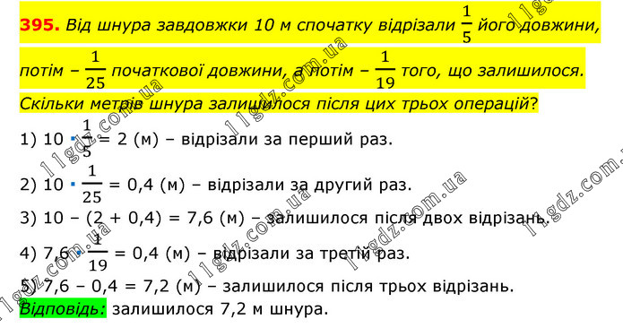Від шнура завдовжки 10 м спочатку відрізали 1/5 його довжини, потім – 1/25 початкової довжини, а потім – 1/19 того, що залишилося. Скільки метрів шнура залишилося після цих трьох операцій? 1) 10 ∙ 1/5 = 2 (м) – відрізали за перший раз. 2) 10 ∙ 1/25 = 0,4 (м) – відрізали за другий раз. 3) 10 – (2 + 0,4) = 7,6 (м) – залишилося після двох відрізань. 4) 7,6 ∙ 1/19 = 0,4 (м) – відрізали за третій раз. 5) 7,6 – 0,4 = 7,2 (м) – залишилося після трьох відрізань. Відповідь: залишилося 7,2 м шнура.