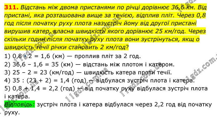 Відстань між двома пристанями по річці дорівнює 36,6 км. Від пристані, яка розташована вище за течією, відплив пліт. Через 0,8 год після початку руху плота назустріч йому від другої пристані вирушив катер, власна швидкість якого дорівнює 25 км/год. Через скільки годин після початку руху плота вони зустрінуться, якщ о швидкість течії річки становить 2 км/год? 1) 0,8 ∙ 2 = 1,6 (км) — проплив пліт за 2 год. 2) 36,6 – 1,6 = 35 (км) — відстань між плотом і катером. 3) 25 – 2 = 23 (км/год) — швидкість катера проти течії. 4) 35 : (23 + 2) = 1,4 (год) — відбулася зустріч плота і катера. 5) 0,8 + 1,4 = 2,2 (год) — від початку руху відбулася зустріч плота і катера. Відповідь: зустріч плота і катера відбулася через 2,2 год від початку руху.
