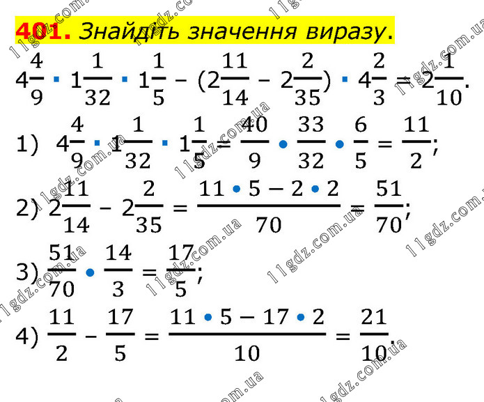 Знайдіть значення виразу. 44/9 ∙ 11/32 ∙ 11/5 – (211/14 – 22/35) ∙ 42/3 = 21/10. 1) 44/9 ∙ 11/32 ∙ 11/5 = 40/9 • 33/32 • 6/5 = 11/2; 2) 211/14 – 22/35 = (11 • 5 - 2 • 2)/70 = 51/70; 3) 51/70 • 14/3 = 17/5; 4) 11/2 – 17/5 = (11 • 5 - 17 • 2)/10 = 21/10.