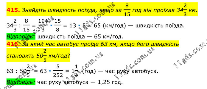 415. Знайдіть швидкість поїзда, якщо за 8/15 год він проїхав 342/3 км. 342/3 : 8/15 = 104/3 ∙ 15/8 = 13 ∙ 5 = 65 (км/год) — швидкість поїзда. Відповідь: швидкість поїзда — 65 км/год. 416. За який час автобус проїде 63 км, якщо його швидкість становить 502/5 км/год? 63 : 502/5 = 63 ∙ 5/252 = 11/4 (год) — час руху автобуса. Відповідь: час руху автобуса — 1,25 год.