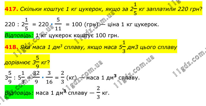 417. Скільки коштує 1 кг цукерок, якщо за 21/5 кг заплатили 220 грн? 220 : 21/5 = 220 ∙ 5/11 = 100 (грн) — ціна 1 кг цукерок. Відповідь: 1 кг цукерок коштує 100 грн. 418. Яка маса 1 дм3 сплаву, якщо маса 51/3 дм3 цього сплаву дорівнює 35/9 кг? 35/9 : 51/3 = 32/9 ∙ 3/16 = 2/3 (кг) — маса 1 дм3 сплаву. Відповідь: маса 1 дм3 сплаву — 2/3 кг.