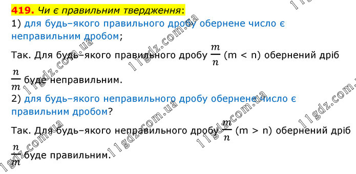 Чи є правильним твердження: 1) для будь–якого правильного дробу обернене число є неправильним дробом; Так. Для будь–якого правильного дробу m/n (m < n) обернений дріб n/m буде неправильним. 2) для будь–якого неправильного дробу обернене число є правильним дробом? Так. Для будь–якого неправильного дробу m/n (m > n) обернений дріб n/m буде правильним.