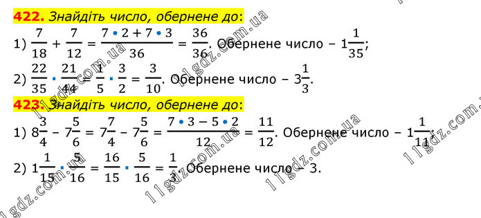 422. Знайдіть число, обернене до: 1) 7/18 + 7/12 = (7 • 2 + 7 • 3)/36 = 36/36. Обернене число – 11/35; 2) 22/35 ∙ 21/44 = 1/5 ∙ 3/2 = 3/10. Обернене число – 31/3. 423. Знайдіть число, обернене до: 1) 83/4 – 75/6 = 77/4 – 75/6 = (7 • 3 - 5 • 2)/12 = 11/12. Обернене число – 11/11; 2) 11/15 ∙ 5/16 = 16/15 ∙ 5/16 = 1/3. Обернене число – 3.