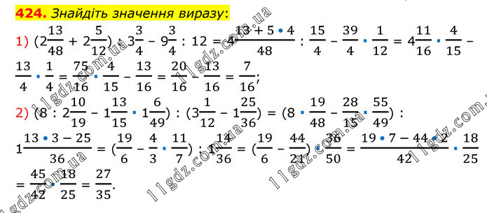 Знайдіть значення виразу: 1) (213/48 + 25/12) : 33/4 – 93/4 : 12 = 4(13 + 5 • 4)/48 : 15/4 – 39/4 ∙ 1/12 = 411/16 ∙ 4/15 – 13/4 ∙ 1/4 = 75/16 ∙ 4/15 – 13/16 = 20/16 – 13/16 = 7/16; 2) (8 : 210/19 – 113/15 ∙ 16/49) : (31/12 – 125/36) = (8 ∙ 19/48 – 28/15 ∙ 55/49) : 1(13 • 3 - 25)/36 = (19/6 – 4/3 ∙ 11/7) : 114/36 = (19/6 – 44/21) ∙ 36/50 = (19 • 7 - 44 • 2)/42 ∙ 18/25 = 45/42 ∙ 18/25 = 27/35.