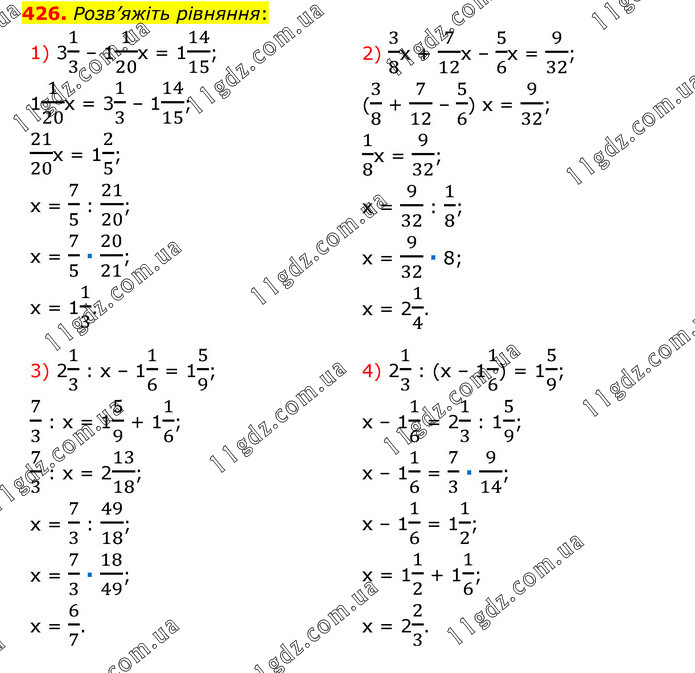 Розв’яжіть рівняння: 1) 31/3 – 11/20х = 114/15; 11/20х = 31/3 – 114/15; 21/20х = 12/5; х = 7/5 : 21/20; х = 7/5 ∙ 20/21; х = 11/3. 2) 3/8х + 7/12х – 5/6х = 9/32; (3/8 + 7/12 – 5/6) х = 9/32; 1/8х = 9/32; х = 9/32 : 1/8; х = 9/32 ∙ 8; х = 21/4. 3) 21/3 : х – 11/6 = 15/9; 7/3 : х = 15/9 + 11/6; 7/3 : х = 213/18; х = 7/3 : 49/18; х = 7/3 ∙ 18/49; х = 6/7. 4) 21/3 : (х – 11/6) = 15/9; х – 11/6 = 21/3 : 15/9; х – 11/6 = 7/3 ∙ 9/14; х – 11/6 = 11/2; х = 11/2 + 11/6; х = 22/3.