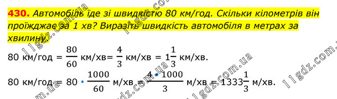 Автомобіль їде зі швидкістю 80 км/год. Скільки кілометрів він проїжджає за 1 хв? Виразіть швидкість автомобіля в метрах за хвилину. 80 км/год = 80/60 км/хв= 4/3 км/хв = 11/3 км/хв. 80 км/год = 80 ∙ 1000/60 м/хв = (4 • 1000)/3 м/хв = 13331/3 м/хв.
