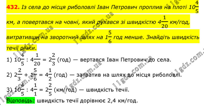 Із села до місця риболовлі Іван Петрович проплив на плоті 104/5 км, а повертався на човні, який рухався зі швидкістю 41/20 км/год, витративши на зворотний шлях на 15/6 год менше. Знайдіть швидкість течії річки. 1) 104/5 : 41/20 = 22/3 (год) — вертався Іван Петрович до села. 2) 22/(3 ) + 15/6 = 41/2 (год) — затратив на шлях до місця риболовлі. 3) 104/5 : 41/1 = 22/5 (км/год) — швидкість течії. Відповідь: швидкість течії дорівнює 2,4 км/год.