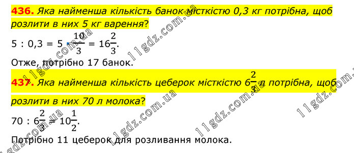 436. Яка найменша кількість банок місткістю 0,3 кг потрібна, щоб розлити в них 5 кг варення? 5 : 0,3 = 5 ∙ 10/3 = 162/3. Отже, потрібно 17 банок. 437. Яка найменша кількість цеберок місткістю 62/3 л потрібна, щоб розлити в них 70 л молока? 70 : 62/3 = 101/2. Потрібно 11 цеберок для розливання молока.