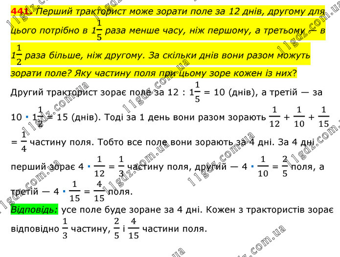 Перший тракторист може зорати поле за 12 днів, другому для цього потрібно в 11/5 раза менше часу, ніж першому, а третьому — в 11/2 раза більше, ніж другому. За скільки днів вони разом можуть зорати поле? Яку частину поля при цьому зоре кожен із них? Другий тракторист зорає поле за 12 : 11/5 = 10 (днів), а третій — за 10 ∙ 11/2 = 15 (днів). Тоді за 1 день вони разом зорають 1/12 + 1/10 + 1/15 = 1/4 частину поля. Тобто все поле вони зорають за 4 дні. За 4 дні перший зорає 4 ∙ 1/12 = 1/3 частину поля, другий — 4 ∙ 1/10 = 2/5 поля, а третій — 4 ∙ 1/15 = 4/15 поля. Відповідь: усе поле буде зоране за 4 дні. Кожен з трактористів зорає відповідно 1/3 частину, 2/5 і 4/15 частини поля.