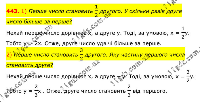 1) Перше число становить 1/2 другого. У скільки разів друге число більше за перше? Нехай перше число дорівнює х, а друге у. Тоді, за умовою, х = 1/2у. Тобто у = 2х. Отже, друге число удвічі більше за перше. 2) Перше число становить 3/2 другого. Яку частину першого числа становить друге? Нехай перше число дорівнює х, а друге – у. Тоді, за умовою, х = 3/2у. Тобто у = 2/3х . Отже, друге число становить 2/3 від першого.