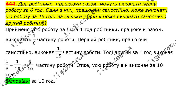 Два робітники, працюючи разом, можуть виконати певну роботу за 6 год. Один з них, працюючи самостійно, може виконати цю роботу за 15 год. За скільки годин її може виконати самостійно другий робітник? Приймемо усю роботу за 1. За 1 год робітники, працюючи разом, виконають 1/6 частину роботи. Перший робітник, працюючи самостійно, виконає 1/15 частину роботи. Тоді другий за 1 год виконає 1/6 – 1/15 = 1/10 частину роботи. Отже, усю роботу він виконає за 10 год. Відповідь: за 10 год.