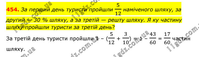 За перший день туристи пройшли 5/12 наміченого шляху, за другий — 30 % шляху, а за третій — решту шляху. Я ку частину шляху пройшли туристи за третій день? За третій день туристи пройшли 1 – (5/12 + 3/10) = 1 – 43/60 = 17/60 частин шляху.