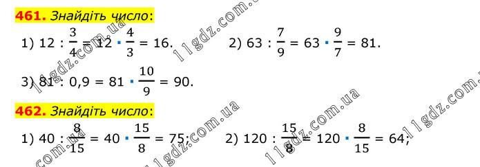 461. Знайдіть число: 1) 12 : 3/4 = 12 ∙ 4/3 = 16. 2) 63 : 7/9 = 63 ∙ 9/7 = 81. 3) 81 : 0,9 = 81 ∙ 10/9 = 90. 462. Знайдіть число: 1) 40 : 8/15 = 40 ∙ 15/8 = 75; 2) 120 : 15/8 = 120 ∙ 8/15 = 64;