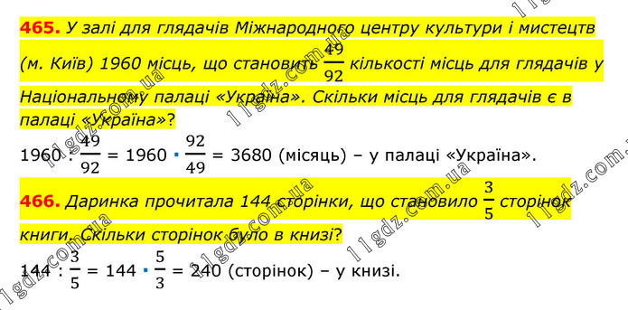 465. У залі для глядачів Міжнародного центру культури і мистецтв (м. Київ) 1960 місць, що становить 49/92 кількості місць для глядачів у Національному палаці «Україна». Скільки місць для глядачів є в палаці «Україна»? 1960 : 49/92 = 1960 ∙ 92/49 = 3680 (місяць) – у палаці «Україна». 466. Даринка прочитала 144 сторінки, що становило 3/5 сторінок книги. Скільки сторінок було в книзі? 144 : 3/5 = 144 ∙ 5/3 = 240 (сторінок) – у книзі.