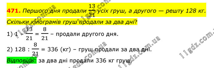 Першого дня продали 13/21 усіх груш, а другого — решту 128 кг. Скільки кілограмів груш продали за два дні? 1) 1 – 13/21 = 8/21 – продали другого дня. 2) 128 : 8/21 = 336 (кг) – груш продали за два дні. Відповідь: за два дні продали 336 кг груш.