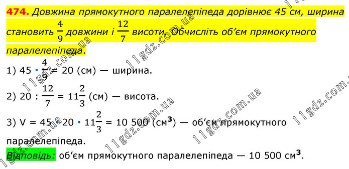 Довжина прямокутного паралелепіпеда дорівнює 45 см, ширина становить 4/9 довжини і 12/7 висоти. Обчисліть об’єм прямокутного паралелепіпеда. 1) 45 ∙ 4/9 = 20 (см) — ширина. 2) 20 : 12/7 = 112/3 (см) — висота. 3) V = 45 ∙ 20 ∙ 112/3 = 10 500 (см3) — об’єм прямокутного паралелепіпеда. Відповідь: об’єм прямокутного паралелепіпеда — 10 500 см3.