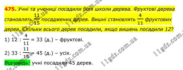 Учні та учениці посадили біля школи дерева. Фруктові дерева становлять 11/15 посаджених дерев. Вишні становлять 4/11 фруктових дерев. Скільки всього дерев посадили, якщо вишень посадили 12? 1) 12 : 4/11 = 33 (д.) – фруктові. 2) 33 : 11/15 = 45 (д.) – усіх. Відповідь: учні посадили 45 дерев.
