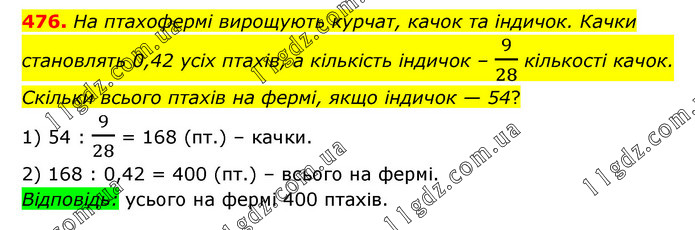 На птахофермі вирощують курчат, качок та індичок. Качки становлять 0,42 усіх птахів, а кількість індичок – 9/28 кількості качок. Скільки всього птахів на фермі, якщо індичок — 54? 1) 54 : 9/28 = 168 (пт.) – качки. 2) 168 : 0,42 = 400 (пт.) – всього на фермі. Відповідь: усього на фермі 400 птахів.