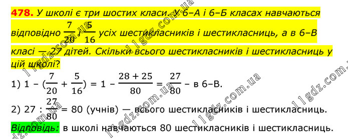 У школі є три шостих класи. У 6–А і 6–Б класах навчаються відповідно 7/20 і 5/16 усіх шестикласників і шестикласниць, а в 6–В класі — 27 дітей. Скільки всього шестикласників і шестикласниць у цій школі? 1) 1 – (7/20 + 5/16) = 1 – (28 + 25)/80 = 27/80 – в 6–В. 2) 27 : 27/80 = 80 (учнів) — всього шестикласників і шестикласниць. Відповідь: в школі навчаються 80 шестикласників і шестикласниць.