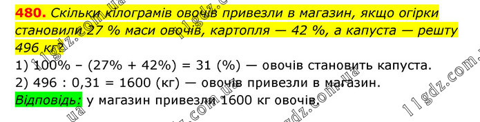 Скільки кілограмів овочів привезли в магазин, якщо огірки становили 27 % маси овочів, картопля — 42 %, а капуста — решту 496 кг? 1) 100% – (27% + 42%) = 31 (%) — овочів становить капуста. 2) 496 : 0,31 = 1600 (кг) — овочів привезли в магазин. Відповідь: у магазин привезли 1600 кг овочів.