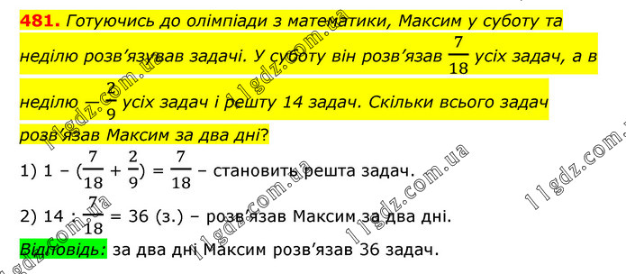 Готуючись до олімпіади з математики, Максим у суботу та неділю розв’язував задачі. У суботу він розв’язав 7/18 усіх задач, а в неділю — 2/9 усіх задач і решту 14 задач. Скільки всього задач розв’язав Максим за два дні? 1) 1 – (7/18 + 2/9) = 7/18 – становить решта задач. 2) 14 : 7/18 = 36 (з.) – розв’язав Максим за два дні. Відповідь: за два дні Максим розв’язав 36 задач.