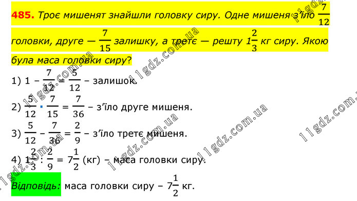 Троє мишенят знайшли головку сиру. Одне мишеня з’їло 7/12 головки, друге — 7/15 залишку, а третє — решту 12/3 кг сиру. Якою була маса головки сиру? 1) 1 – 7/12 = 5/12 – залишок. 2) 5/12 ∙ 7/15 = 7/36 – з’їло друге мишеня. 3) 5/12 – 7/36 = 2/9 – з’їло третє мишеня. 4) 12/3 : 2/9 = 71/2 (кг) – маса головки сиру. Відповідь: маса головки сиру – 71/2 кг.