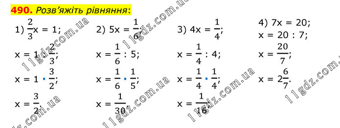 Розв’яжіть рівняння: 1) 2/3х = 1; х = 1 : 2/3; х = 1 ∙ 3/2; х = 3/2. 2) 5х = 1/6; х = 1/6 : 5; х = 1/6 ∙ 1/5; х = 1/30. 3) 4х = 1/4; х = 1/4 : 4; х = 1/4 ∙ 1/4; х = 1/16; 4) 7х = 20; х = 20 : 7; х = 20/7; х = 26/7.