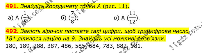 491. Знайдіть координату точки А (рис. 11). а) А (1/6); б) (7/8); в) А (11/12). 492. Замість зірочок поставте такі цифри, щоб трицифрове число *8* ділилося націло на 9. Знайдіть усі можливі розв’язки. 180, 189, 288, 387, 486, 585, 684, 783, 882, 981.