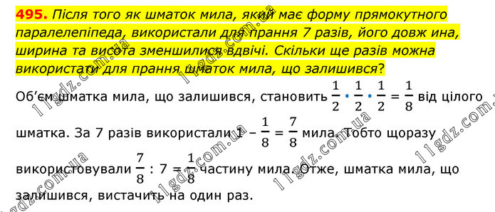 Після того як шматок мила, який має форму прямокутного паралелепіпеда, використали для прання 7 разів, його довж ина, ширина та висота зменшилися вдвічі. Скільки ще разів можна використати для прання шматок мила, що залишився? Об’єм шматка мила, що залишився, становить 1/2 ∙ 1/2 ∙ 1/2 = 1/8 від цілого шматка. За 7 разів використали 1 – 1/8 = 7/8 мила. Тобто щоразу використовували 7/8 : 7 = 1/8 частину мила. Отже, шматка мила, що залишився, вистачить на один раз.