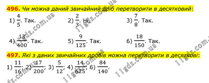 496. Чи можна даний звичайний дріб перетворити в десятковий: 1) 4/5. Так. 2) 2/3. Ні. 3) 7/8. Так. 4) 13/400. Так. 5) 9/125. Так. 6) 18/150. Так. 497. Які з даних звичайних дробів можна перетворити в десяткові: 1) 11/16; 2) 17/200; 3) 5/12; 4) 14/625; 6) 84/140.