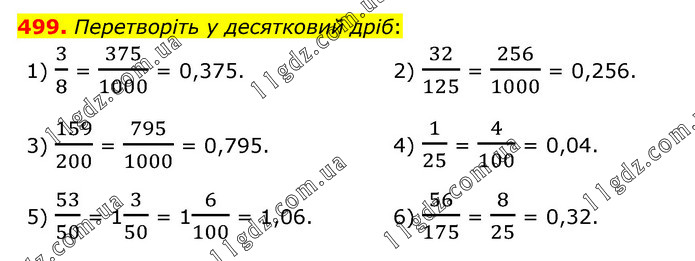 Перетворіть у десятковий дріб: 1) 3/8 = 375/1000 = 0,375. 2) 32/125 = 256/1000 = 0,256. 3) 159/200 = 795/1000 = 0,795. 4) 1/25 = 4/100 = 0,04. 5) 53/50 = 13/50 = 16/100 = 1,06. 6) 56/175 = 8/25 = 0,32.