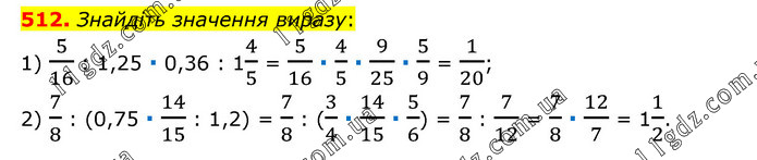 Знайдіть значення виразу: 1) 5/16 : 1,25 ∙ 0,36 : 14/5 = 5/16 ∙ 4/5 ∙ 9/25 ∙ 5/9 = 1/20; 2) 7/8 : (0,75 ∙ 14/15 : 1,2) = 7/8 : (3/4 ∙ 14/15 ∙ 5/6) = 7/8 : 7/12 = 7/8 ∙ 12/7 = 11/2.