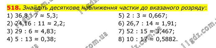Знайдіть десяткове наближення частки до вказаного розряду: 1) 36,8 : 7 ≈ 5,3; 2) 24,16 : 11 ≈ 2,2; 3) 29 : 6 ≈ 4,83; 4) 5 : 13 ≈ 0,38; 5) 2 : 3 ≈ 0,667; 6) 26,7 : 14 ≈ 1,91; 7) 52 : 15 ≈ 3,467; 8) 10 : 17 ≈ 0,5882.