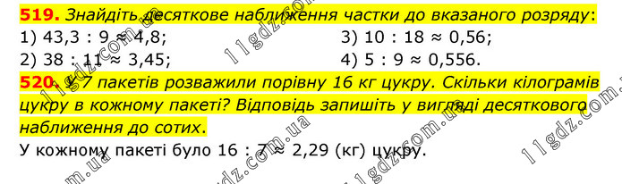 519. Знайдіть десяткове наближення частки до вказаного розряду: 1) 43,3 : 9 ≈ 4,8; 2) 38 : 11 ≈ 3,45; 3) 10 : 18 ≈ 0,56; 4) 5 : 9 ≈ 0,556. 520. У 7 пакетів розважили порівну 16 кг цукру. Скільки кілограмів цукру в кожному пакеті? Відповідь запишіть у вигляді десяткового наближення до сотих. У кожному пакеті було 16 : 7 ≈ 2,29 (кг) цукру.