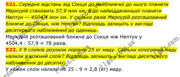 521. Середня відстань від Сонця до найближчої до нього планети Меркурій становить 57,9 млн км, а до найвіддаленішої планети Нептун — 4504,4 млн км. У скільки разів Меркурій розташований ближче до Сонця, ніж Нептун? Відповідь запишіть у вигляді десяткового наближення до одиниць. Меркурій розташований ближче до Сонця ніж Нептун у 4504,4 : 57,9 ≈ 78 разів. 522. У 9 слоїків розлили порівну 25 кг меду. Скільки кілограмів меду налили в кожний слоїк? Відповідь запишіть у вигляді десяткового наближення до десятих. У кожен слоїк налили по 25 : 9 ≈ 2,8 (кг) меду.